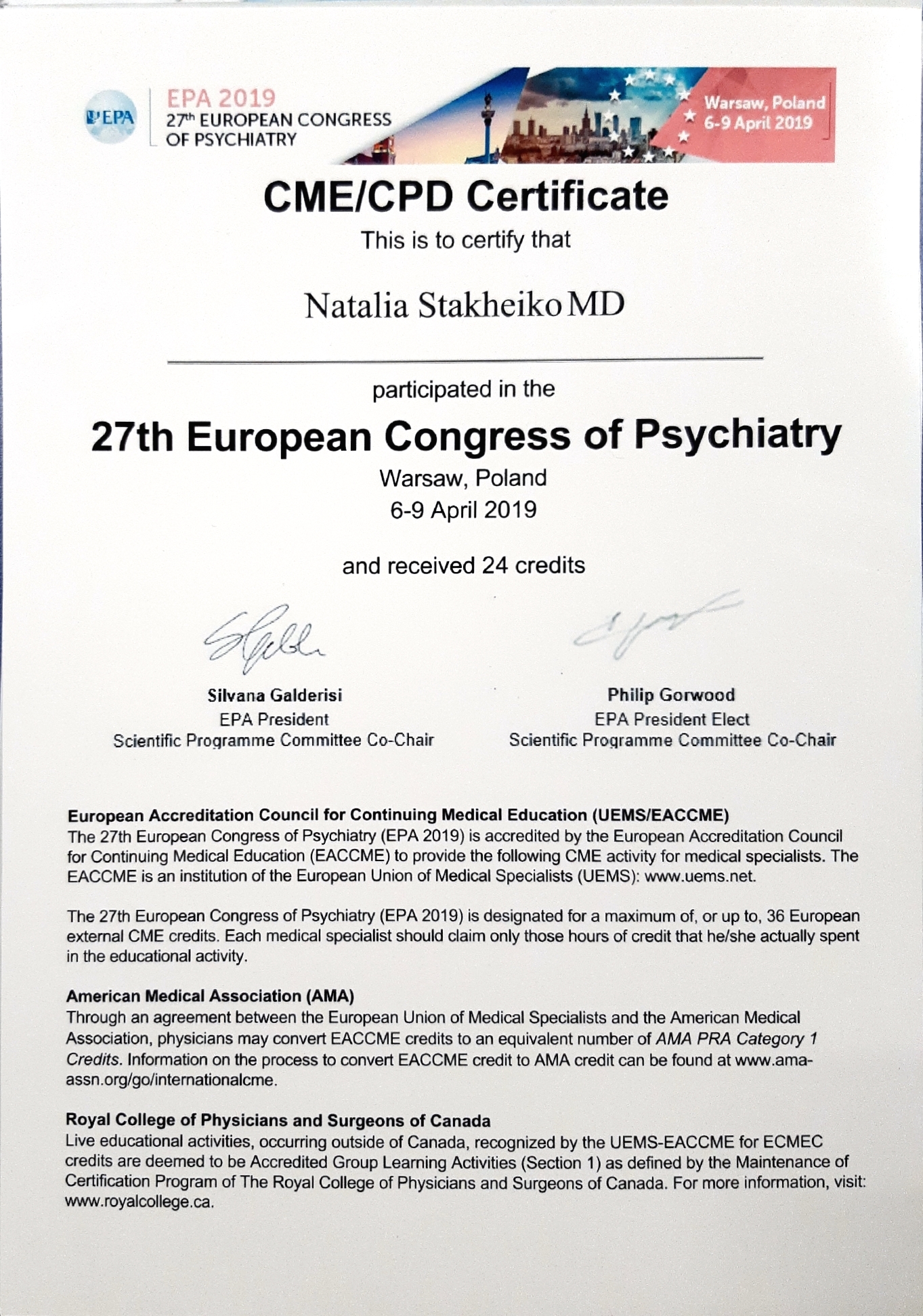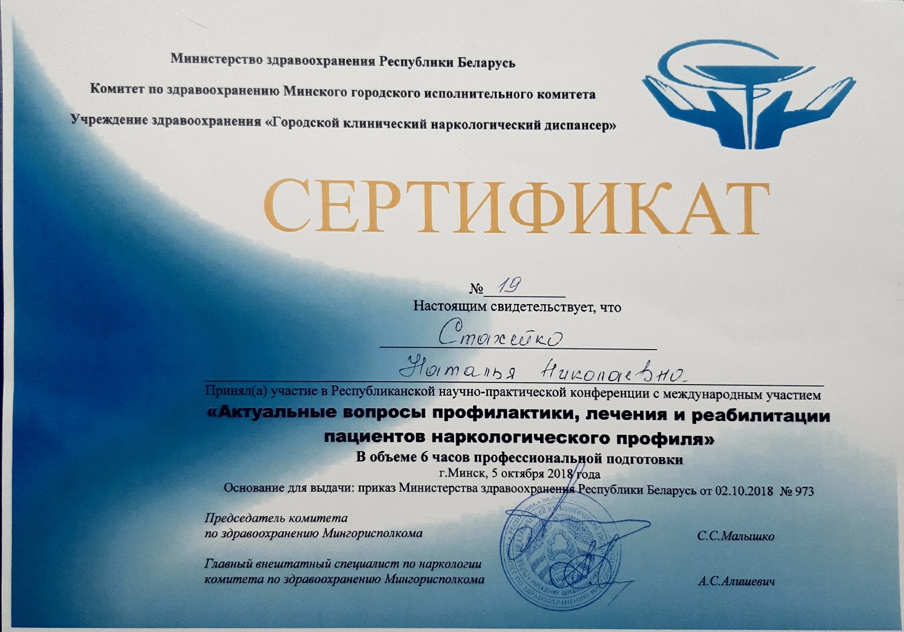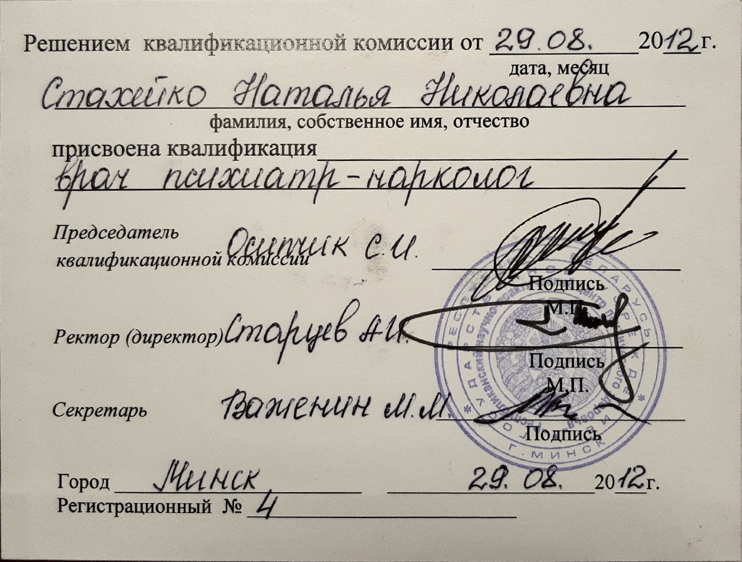 Стахейко Наталья Николаевна в 1999 г. закончила Гомельский государственный медицинский институт, по специальности «лечебное дело», квалификация «врач». С 1999 по 2000 проходила стажировку по психиатрии в учреждении «Гомельская областная клиническая психиатрическая больница» (далее – У «ГОКПБ»). С 2000 по 2006 работала в учреждении «Гомельская Областная Клиническая ПБ» в должности врача-психиатра 13-го наркологического отделения (для купирования острых алкогольных психозов). С 2006 по 2014 работала в государственном учреждении «Республиканский научно-практический центр психического здоровья» (далее – РНПЦ психического здоровья) в должности врача-нарколога, затем врача-психиатра-нарколога 36-го наркологического отделения (для мужчин) и 21-го реабилитационного отделения. С 2014 по 2016 работала в РНПЦ психического здоровья в должности (заведующего отделением наркологического отделения № 17 для лечения больных, страдающих наркоманией. С 2016 по 2018 врач-психиатр-нарколог 21-го наркологического реабилитационного отделения РНПЦ психического здоровья. С 08.2018 по 07.2019 врач-психиатр-нарколог Частного Медицинского Центра. С 08.2019 по настоящее время врач-психиатр-нарколог Медицинского Центра “Консилиум”.