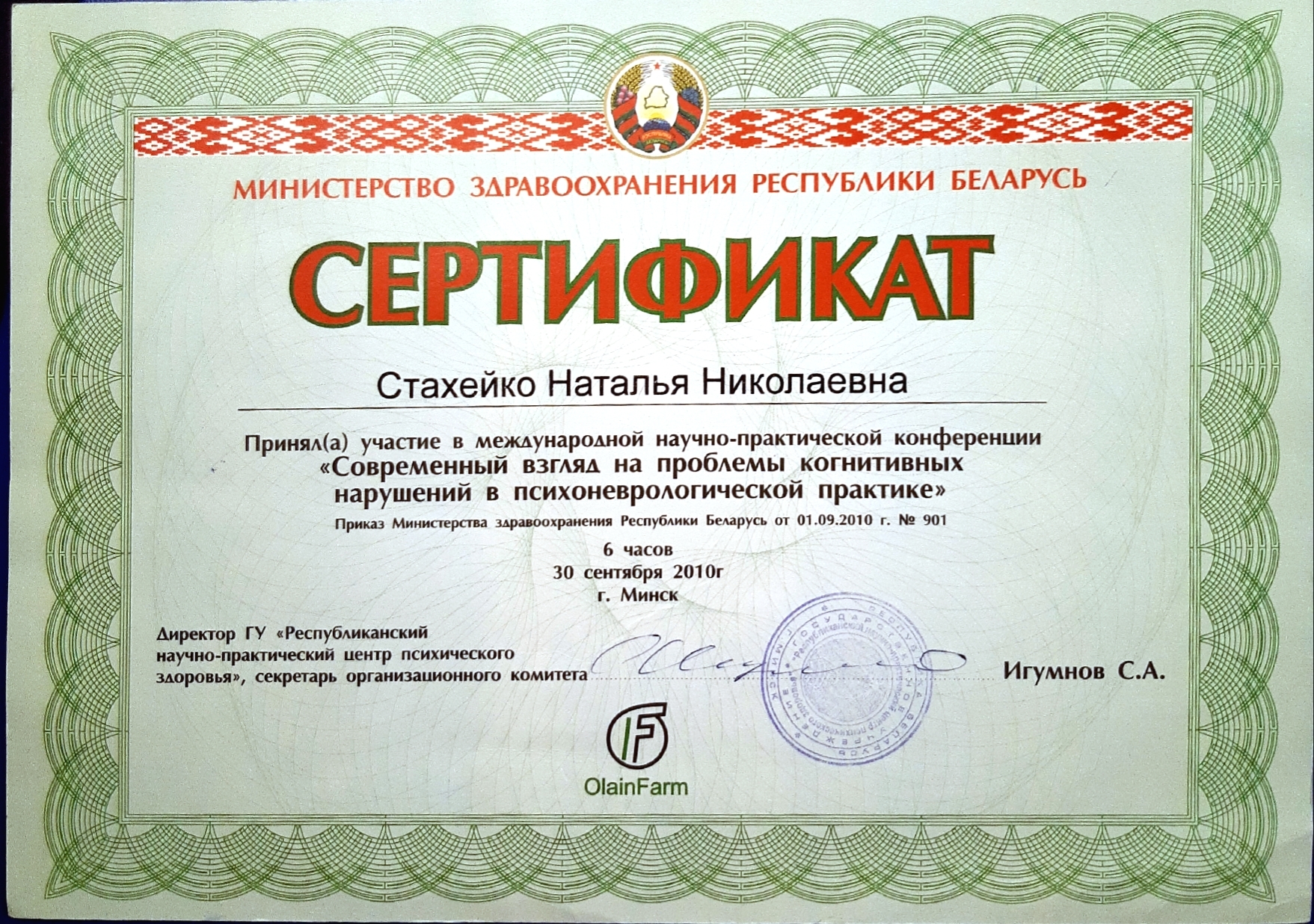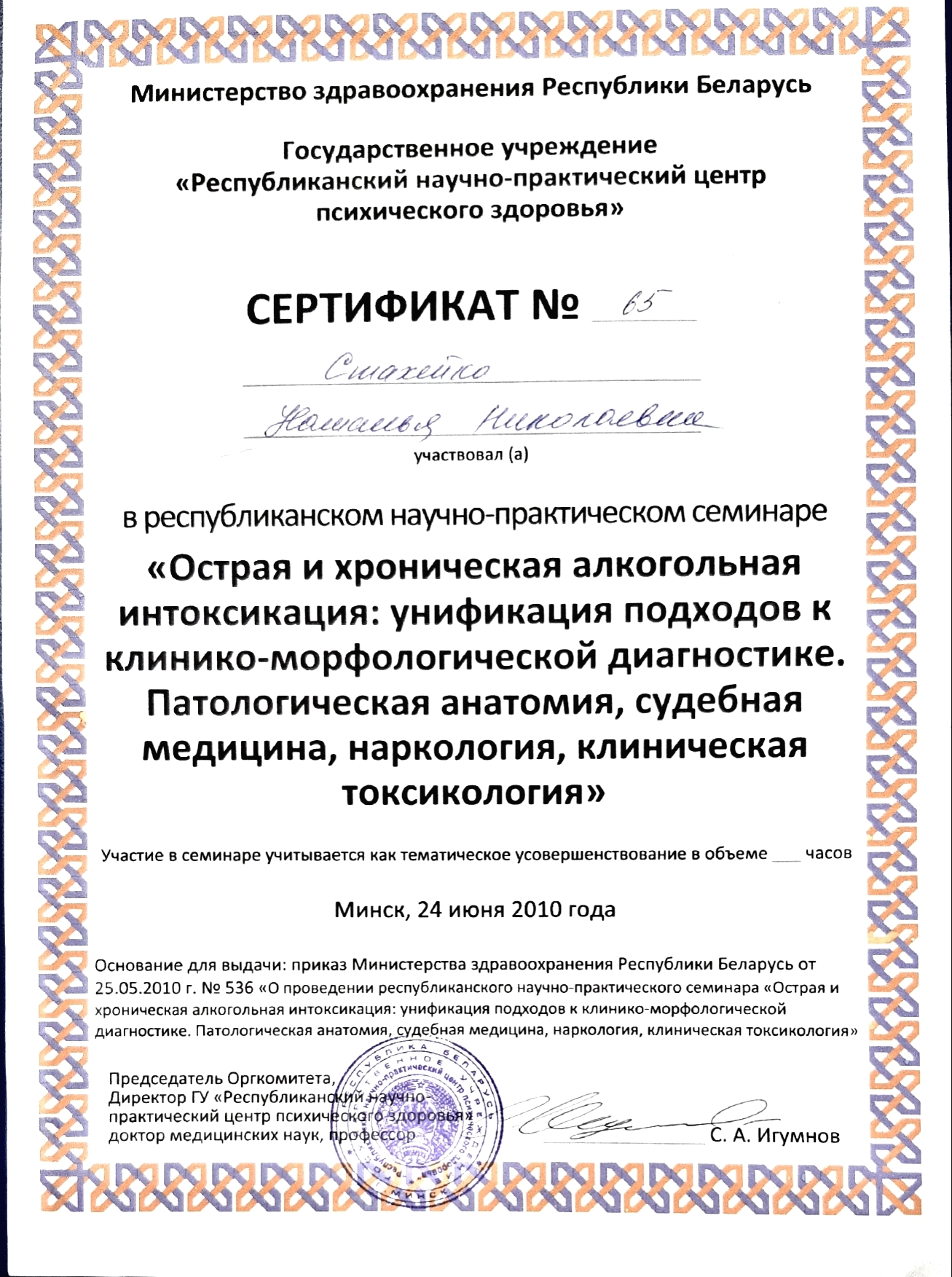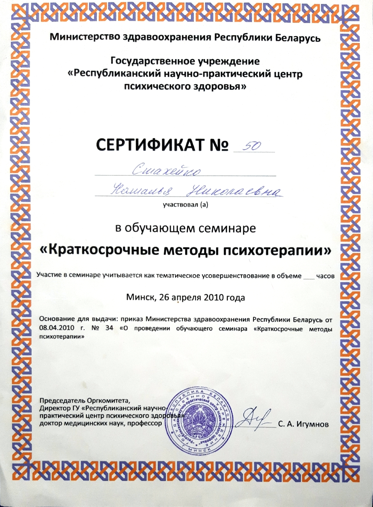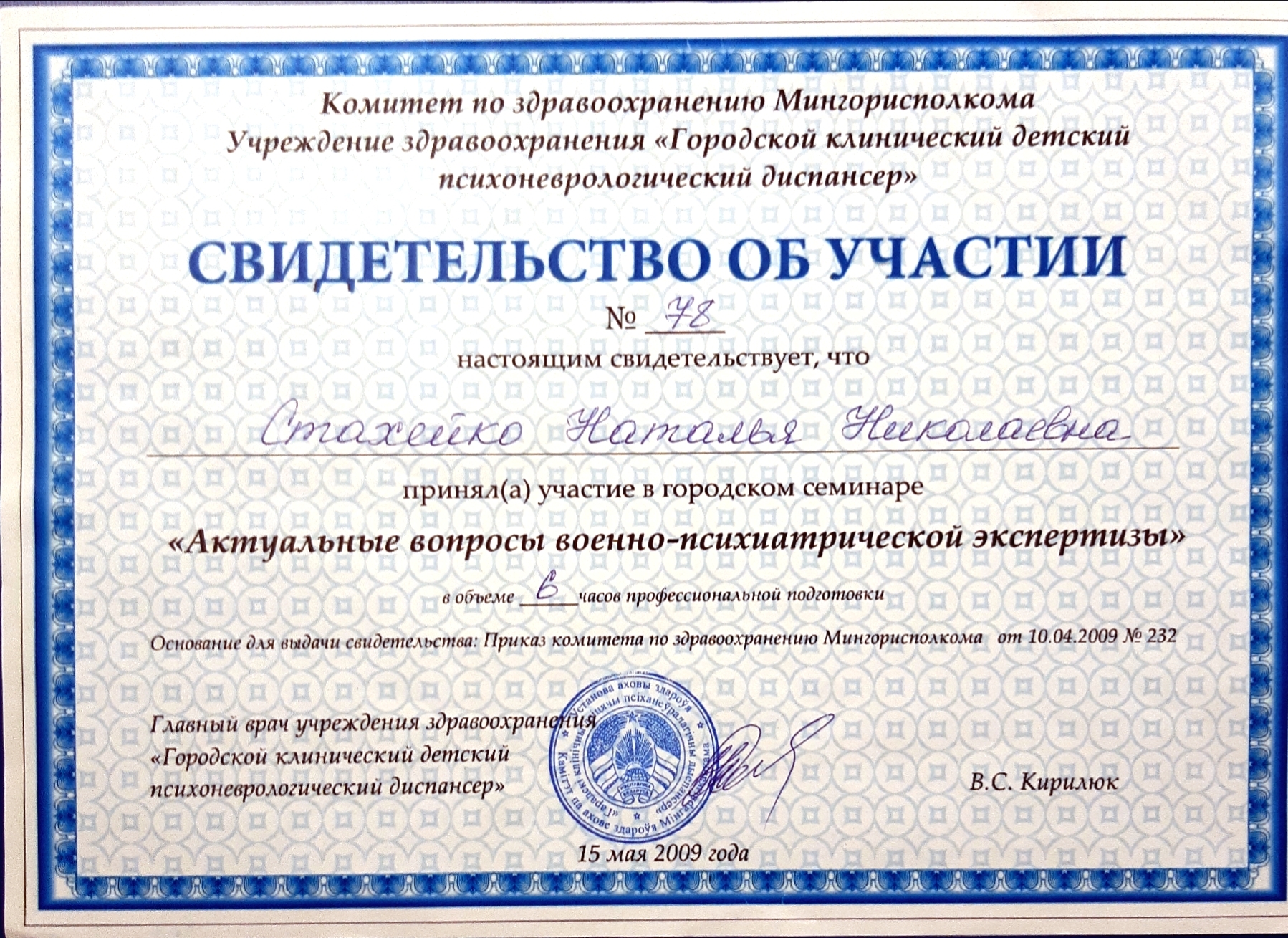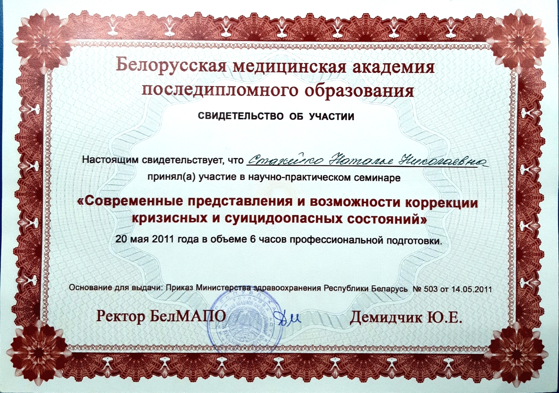 29.05.-27.06.2001 г. — ПК на кафедре психиатрии и наркологии БелМАПО «Актуальные вопросы психиатрии»
