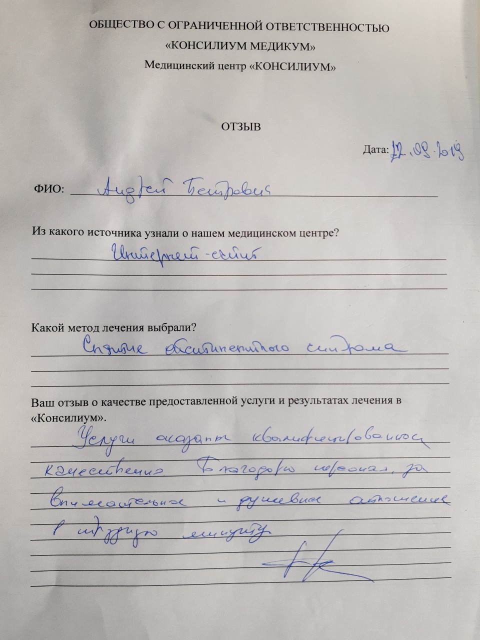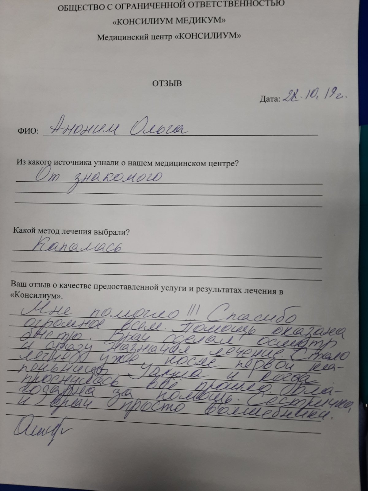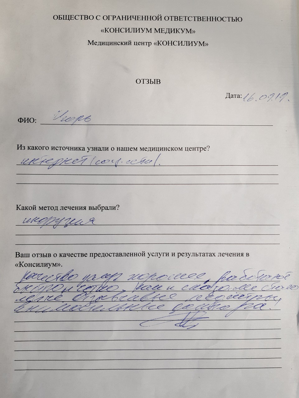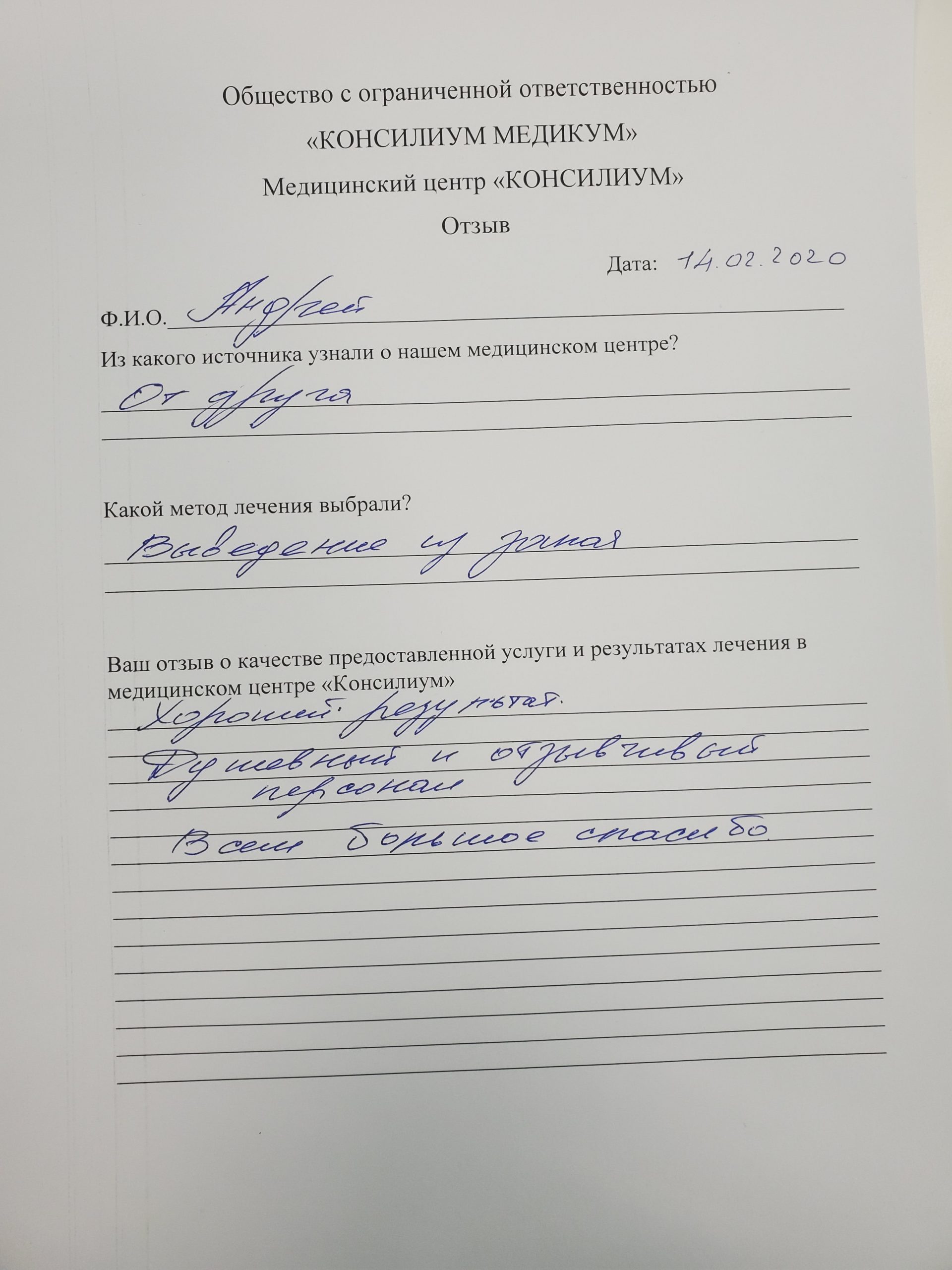 Отзывы наших клиентовВ данном разделе будут опубликованы отзывы клиентов медицинского центра «Консилиум».отзыв1отзыв2отзыв3Отзыв4IMG-9b93882ab9c174f17f3048b9a660385b-VIMG-7b0e262eb61aaf51d575271d98482f6a-V20200214_17401020200214_17401620200214_174021Обсуждение закрыто.
